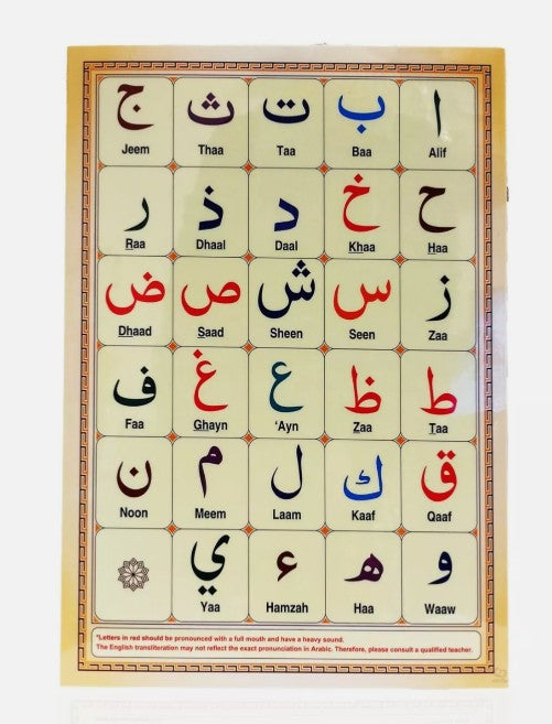 Laminated, coloured Arabic alphabet card for young children. Contains the Arabic Alphabet on one side and mixed letters on the other. Ideal for young children learning to identify letters of the Arabic alphabet.