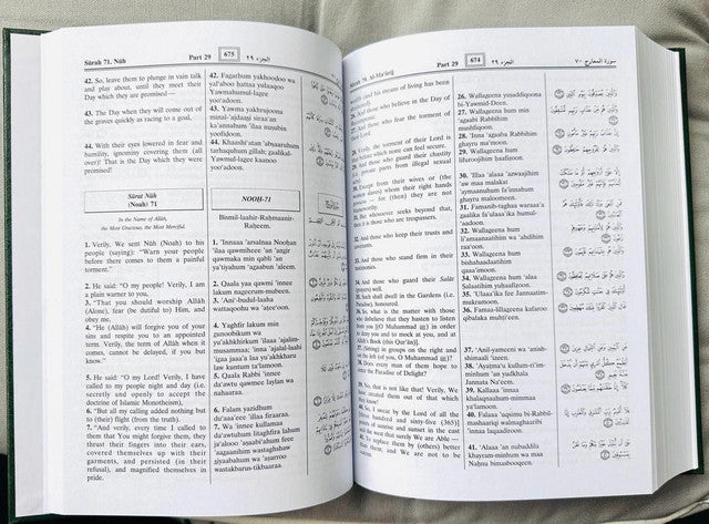 To read the Arabic text of the Qur'anic Verses in their correct form is of prime importance to every Muslim, as the meanings of the Arabic words are changed with little changes of the diacritics. So, to help those readers and reciters who are not too familiar with the Arabic language or cannot read Arabic, Darussalam has prepared this edition of the Noble Qur'an inserting the transliteration of the Noble verses along with their translation.