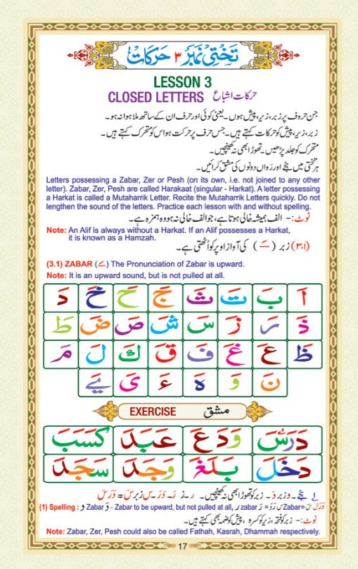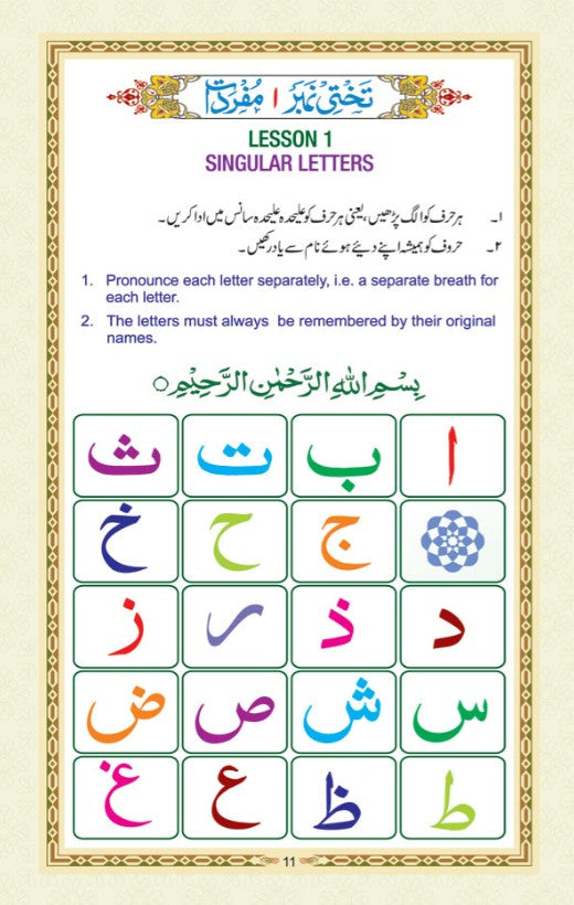 This edition includes detailed instructions in both Urdu and English to help learners understand the rules of Tajwīd (the correct method of Qur’anic recitation).